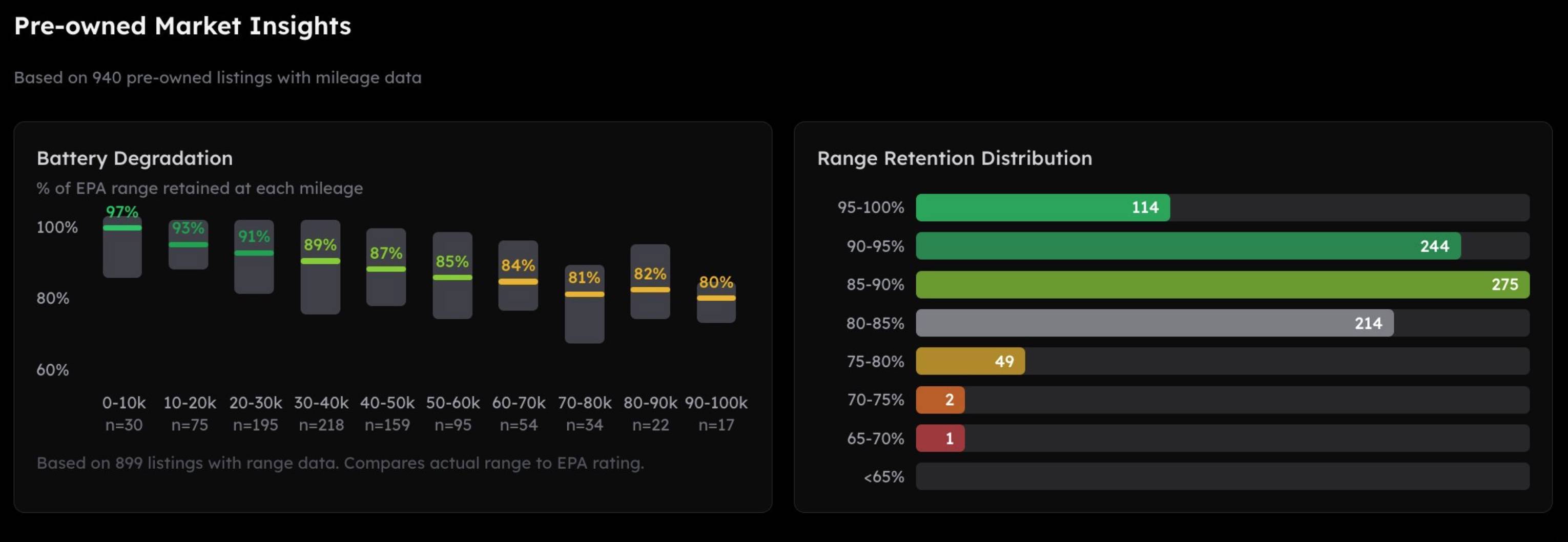 ▲ 参与调查的 950 辆特斯拉中,有 275 辆保持在 85-90% 的电池健康度区间。